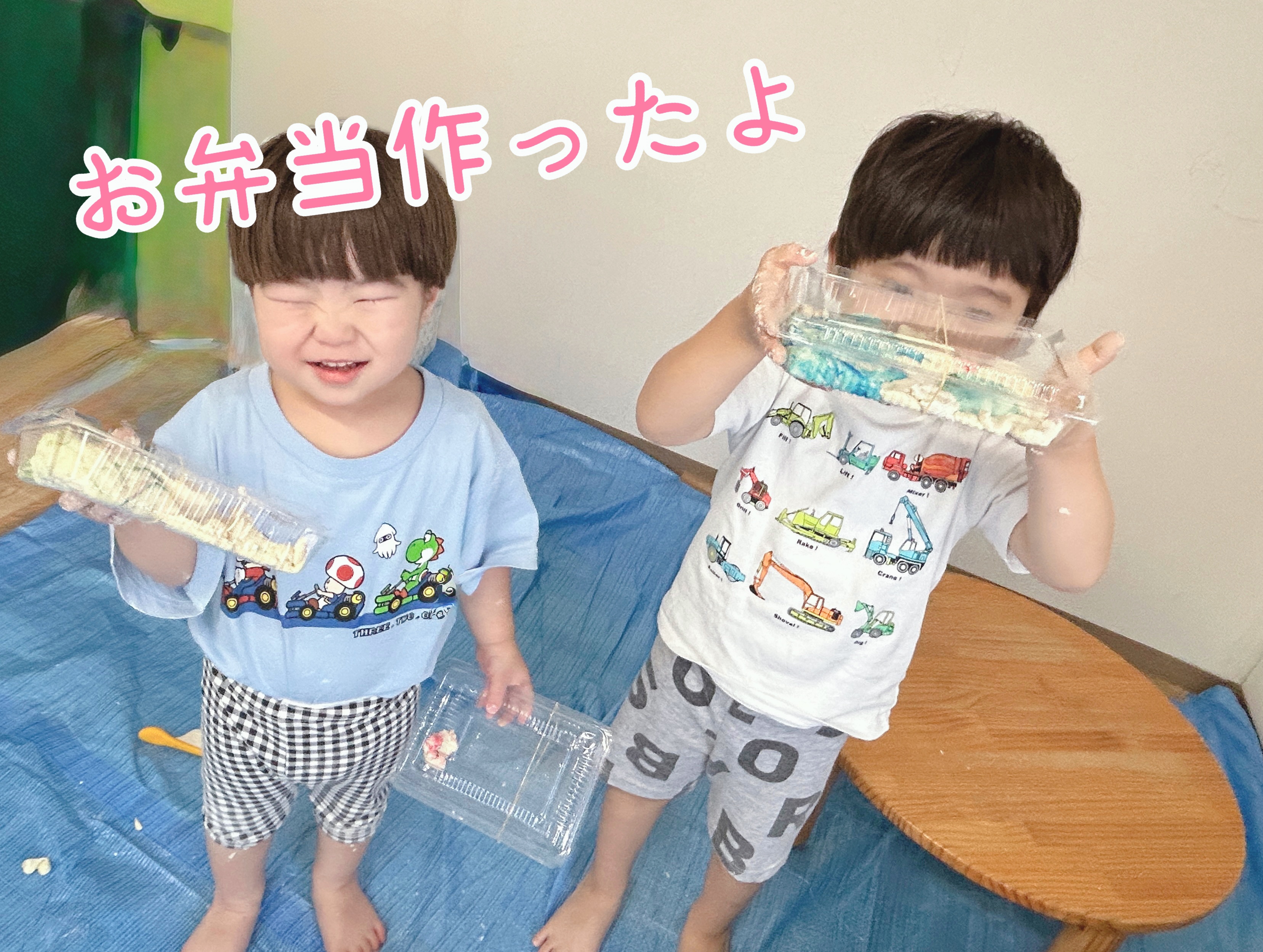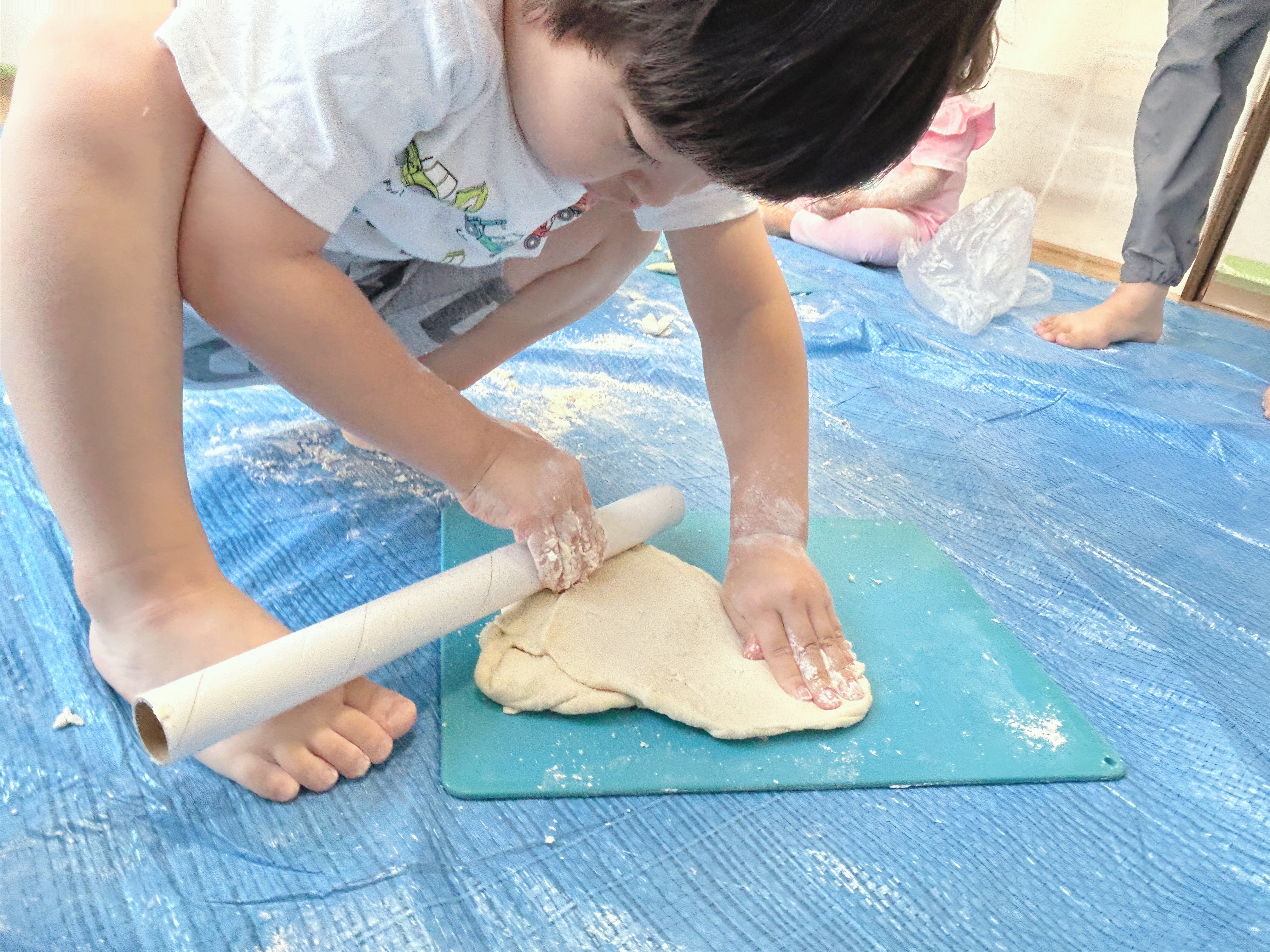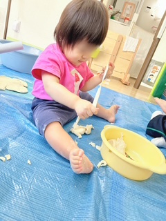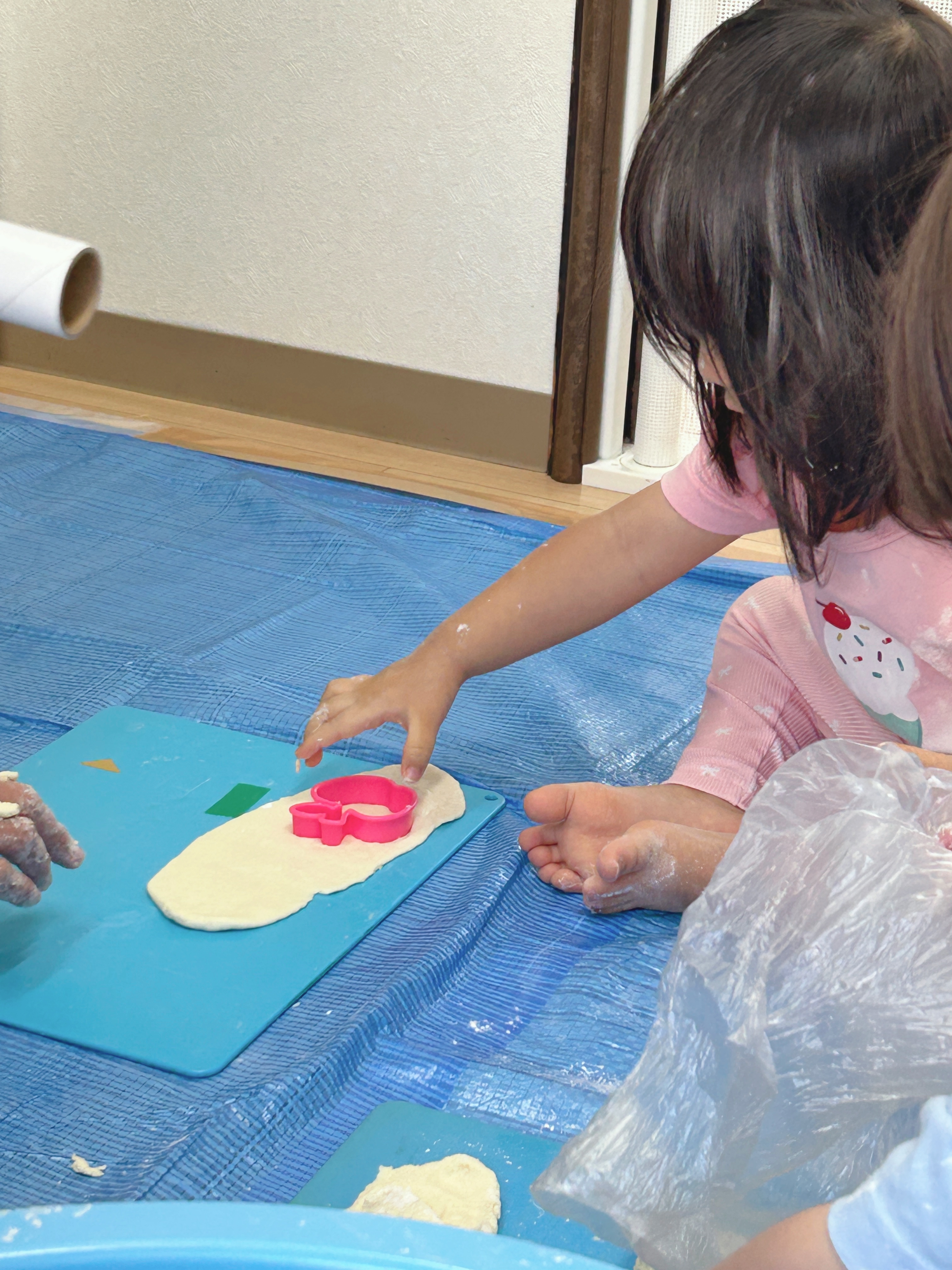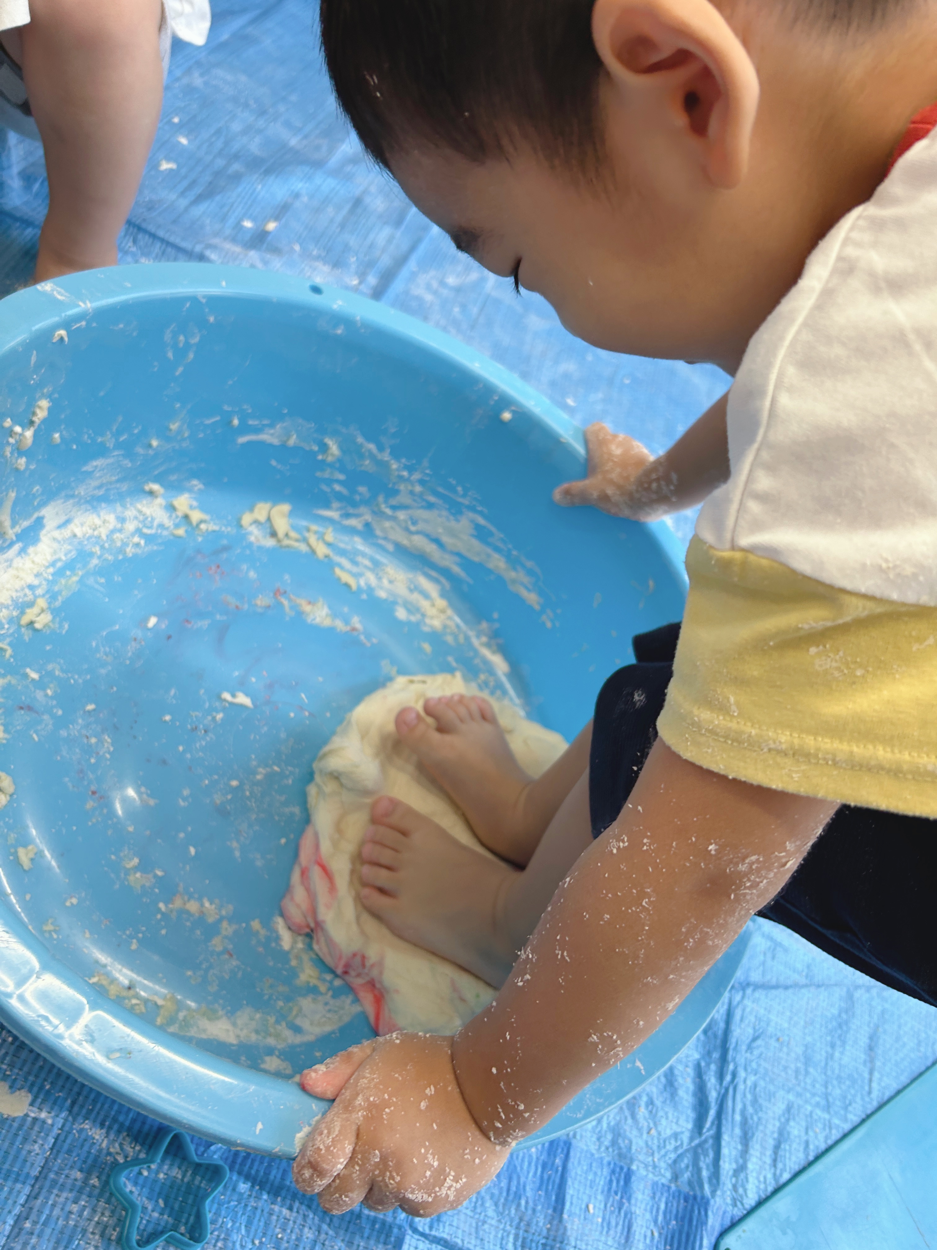 小麦粉に水を少しずつ加え、さらさら→ドロドロ→もちもち→しっとりと感触が変化していく様子を体験しました。「ねんどみたい~」と気づいた子もいましたよ。手や足で五感を味わった後は、丸めたり、ちぎったり、道具を使って、のばしたり、切ったり、型抜きしたり、想像力を働かせながら創作活動へ!作ったものを、パックに詰めて、お弁当作りをした子もいました。お弁当を作った後は、「ピクニックに行ってきま~す」とごっこ遊びへ発展。