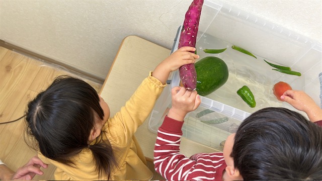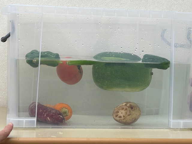 浮く、沈む、は少し難しかったけど「重い!」「軽い!」と重さに気付くことが出来た実験になりました。