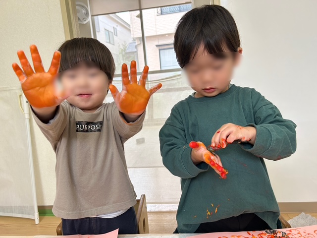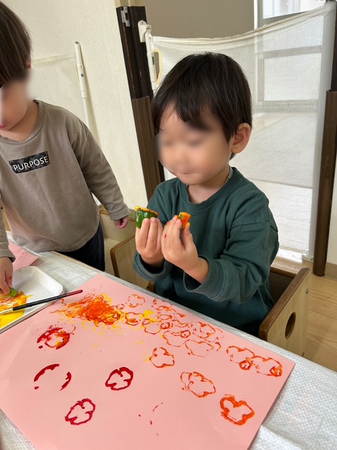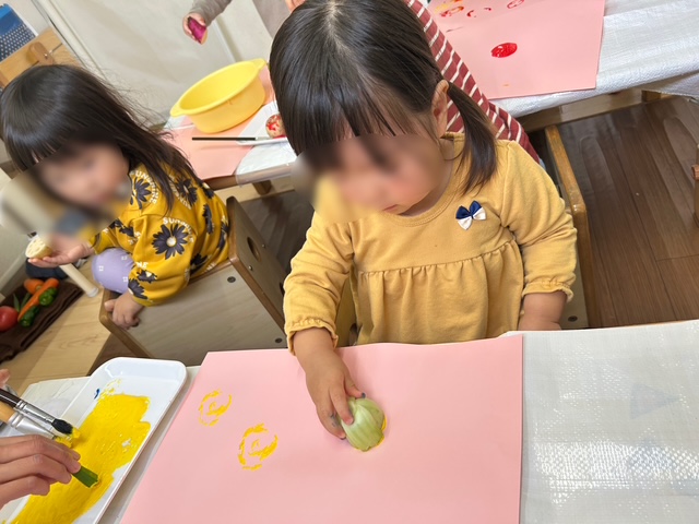 浮き沈み実験で使用したさまざまな野菜でスタンプをしました。「○いろがいいな」「色混ぜたらかわるよ」と色について感じたことがあったり、