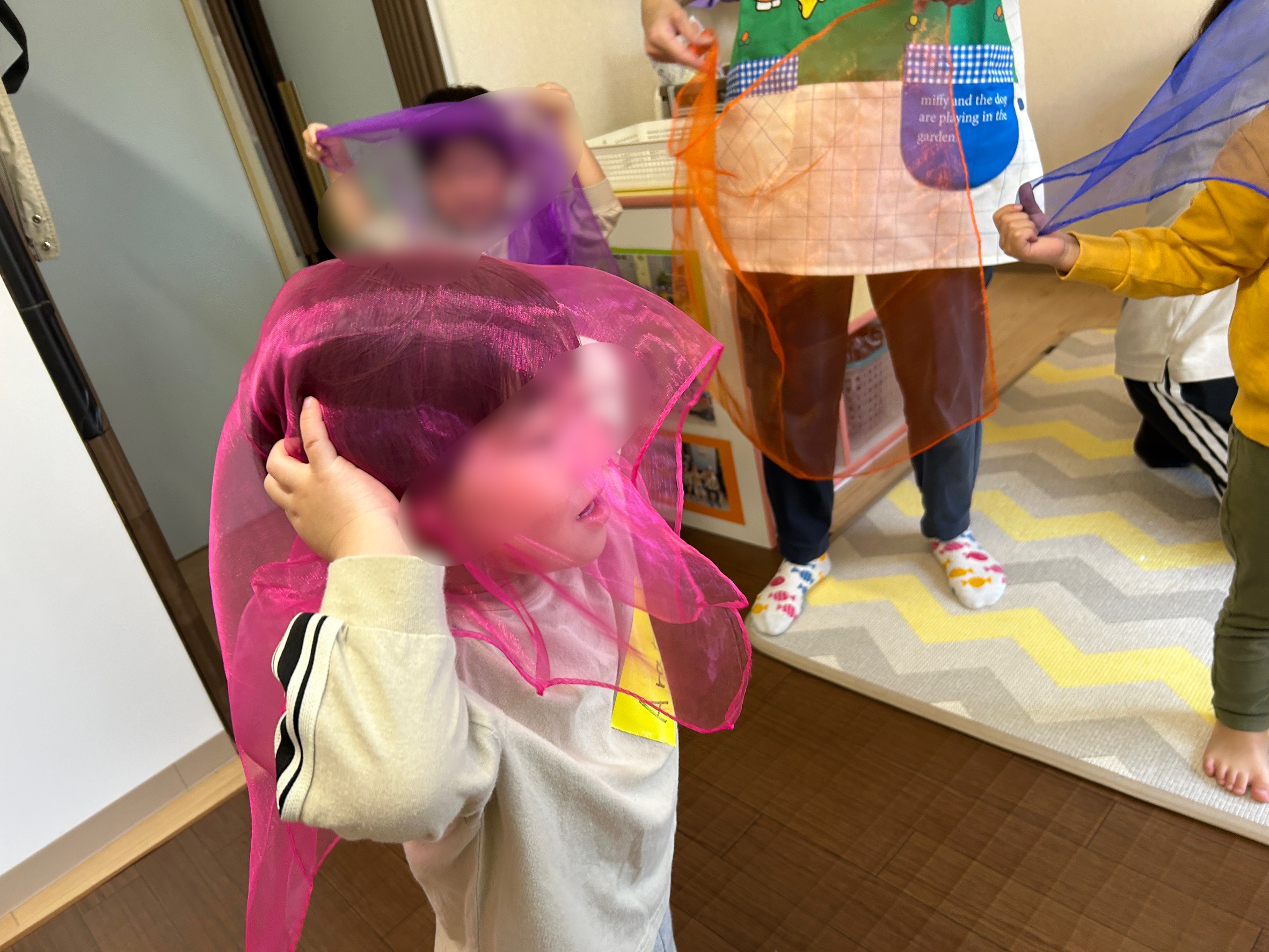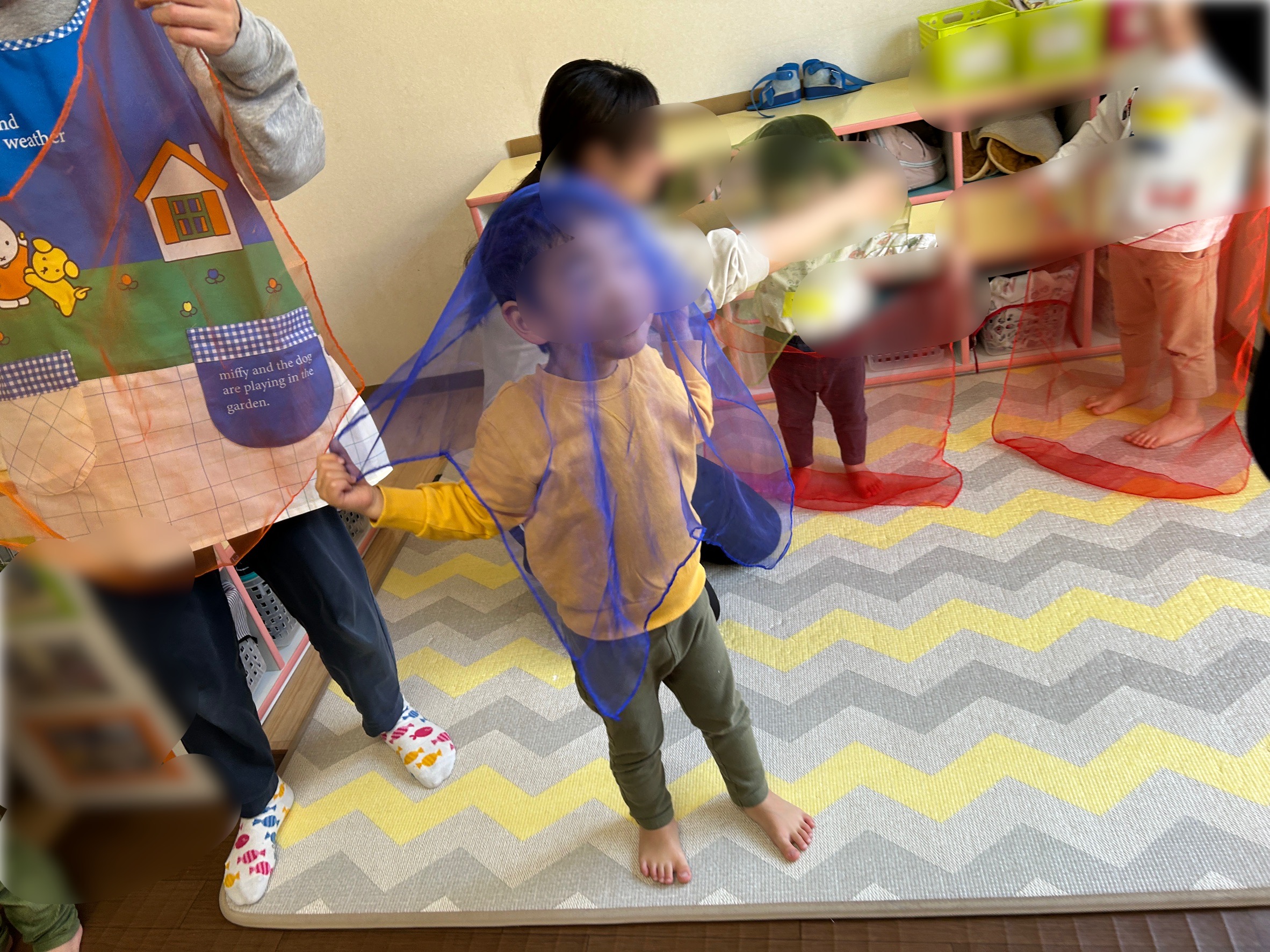 スカーフを使って色を英語で言ってみたり、音楽に合わせて「shake」したり「up」してみたり、体を動かして遊びました。月に一度のひなり先生と会うのはドキドキするけど、遊んでいる内に距離も縮まり、コミュニケーションをとりながら楽しくなってきます。楽しくお話しして、耳で聴いて、自然と英語に関わっています。