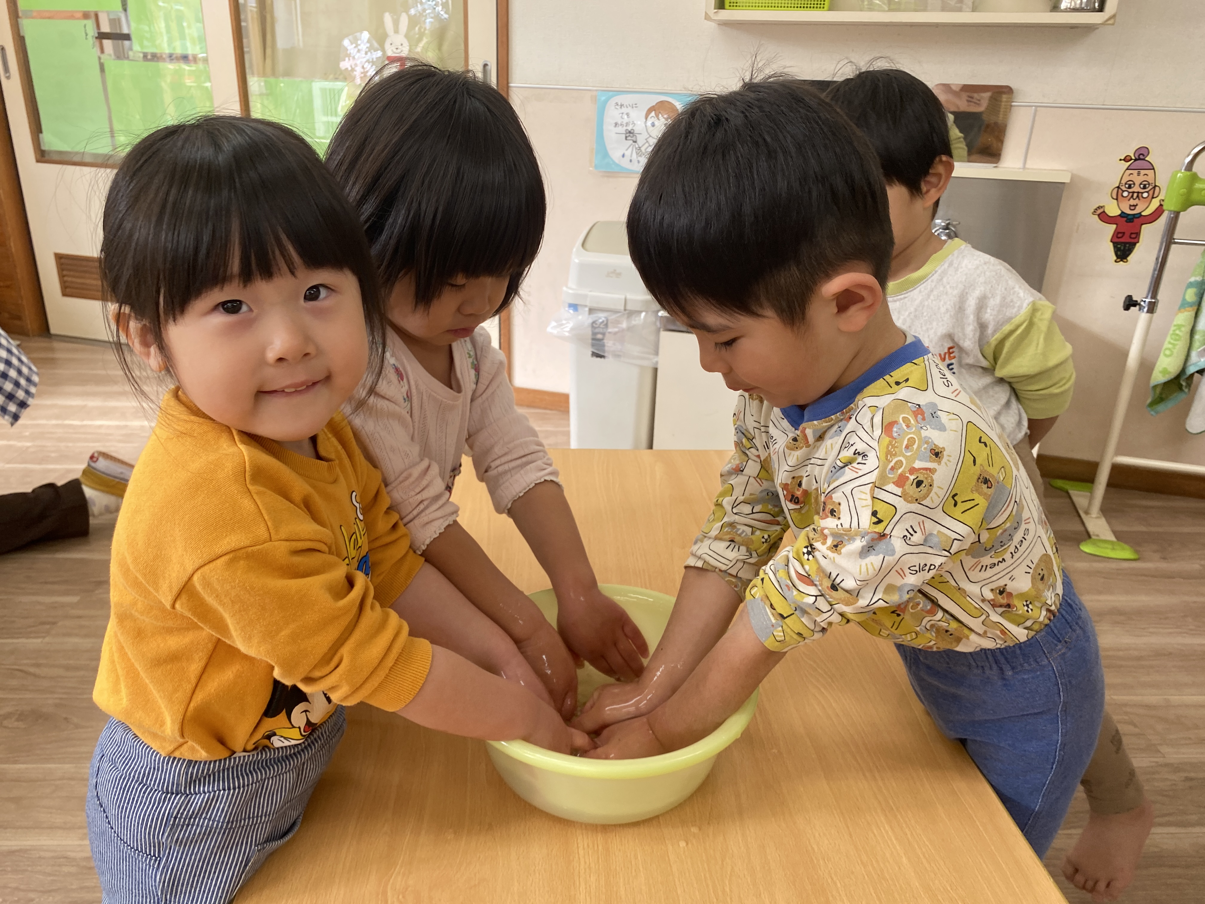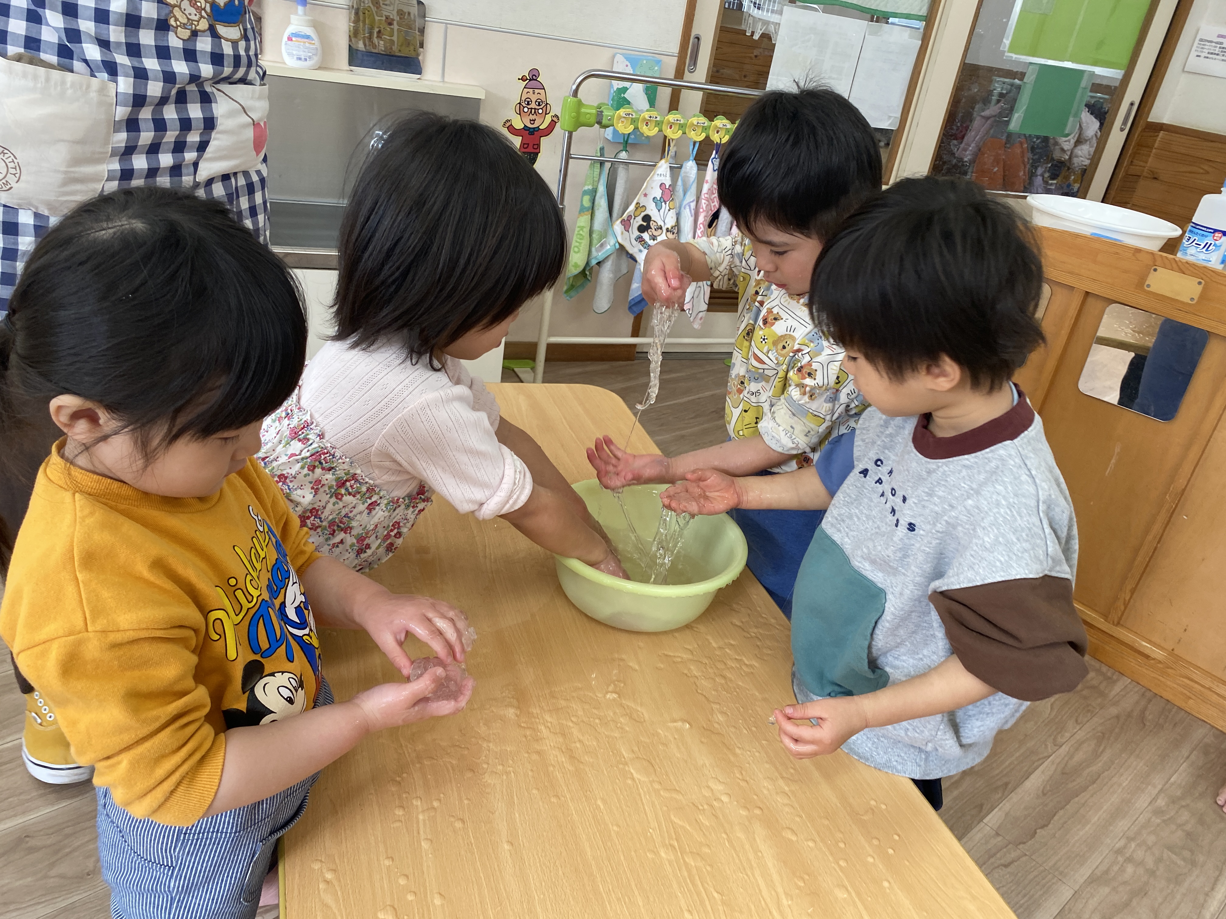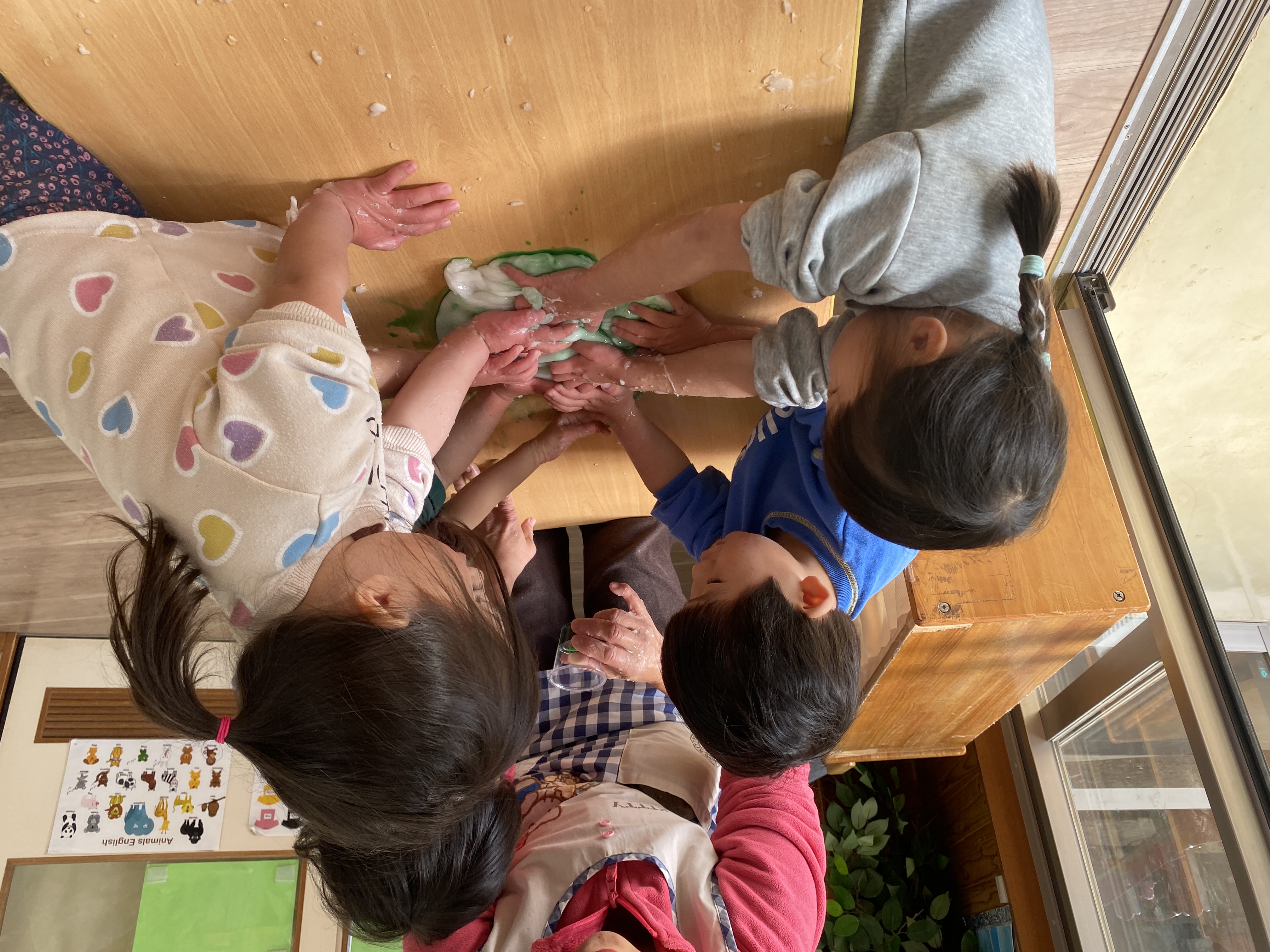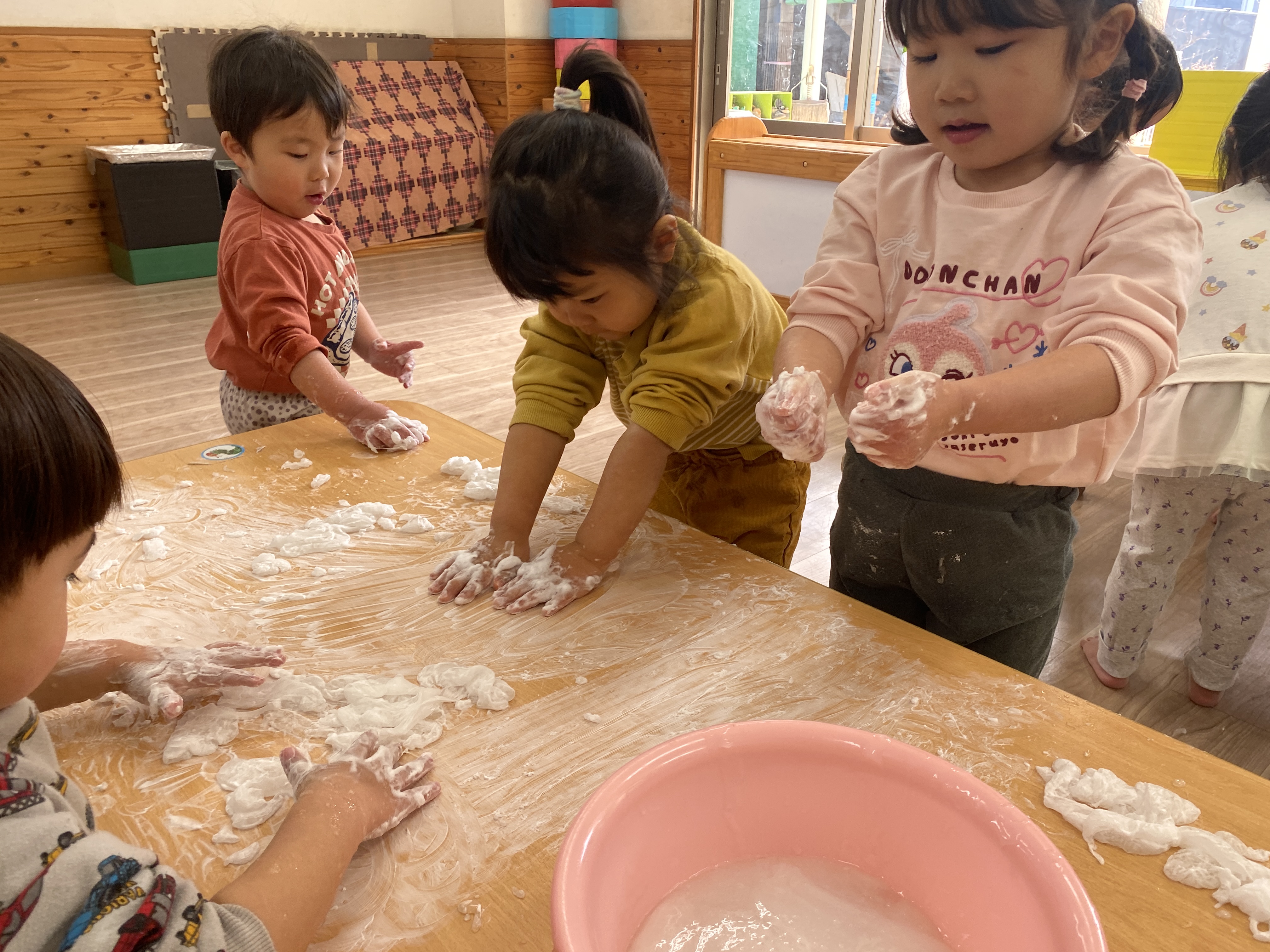 完成したスライムにシェービングクリームや手洗い石鹸の泡を入れて感触の違いも楽しみました♪