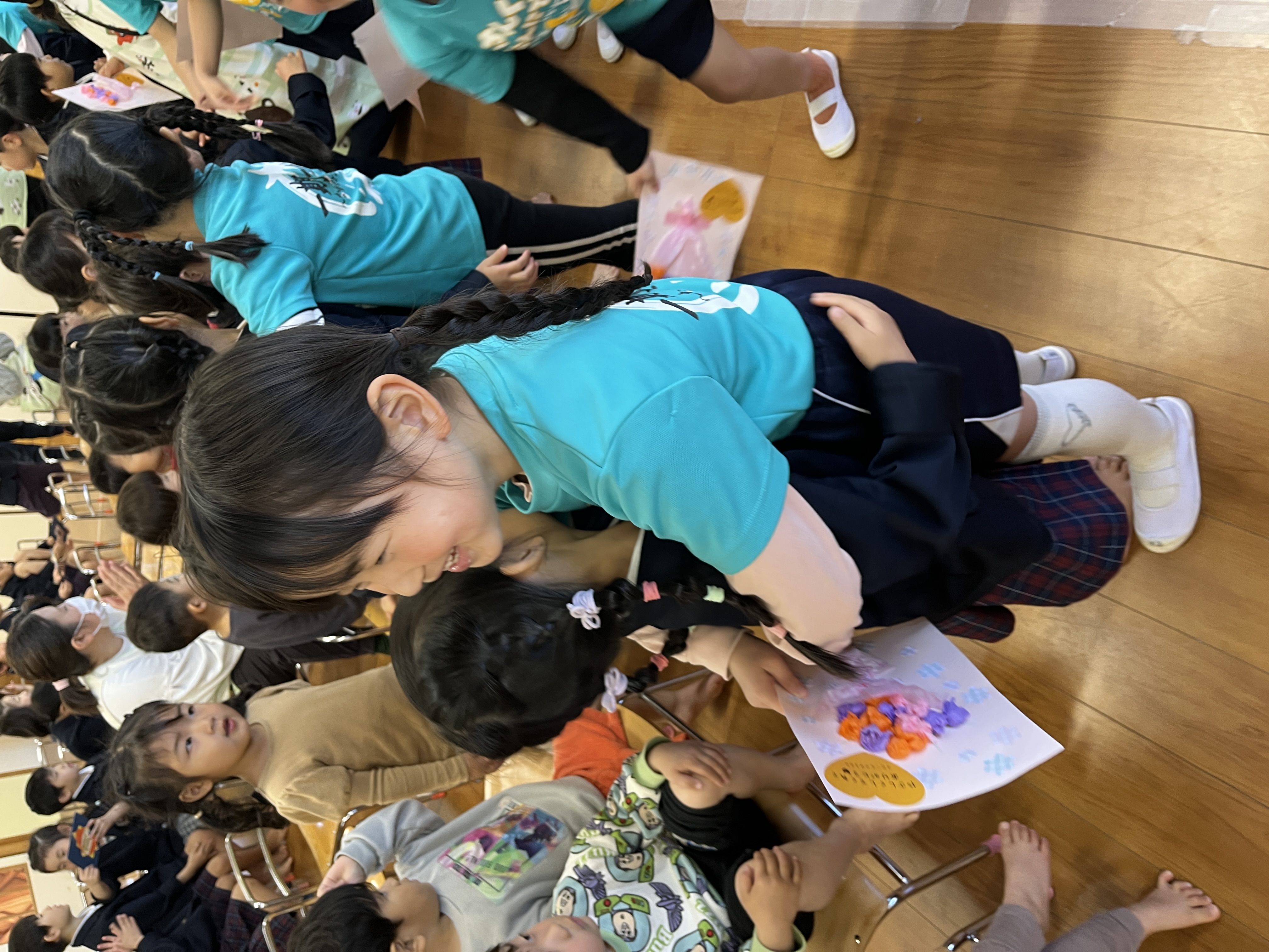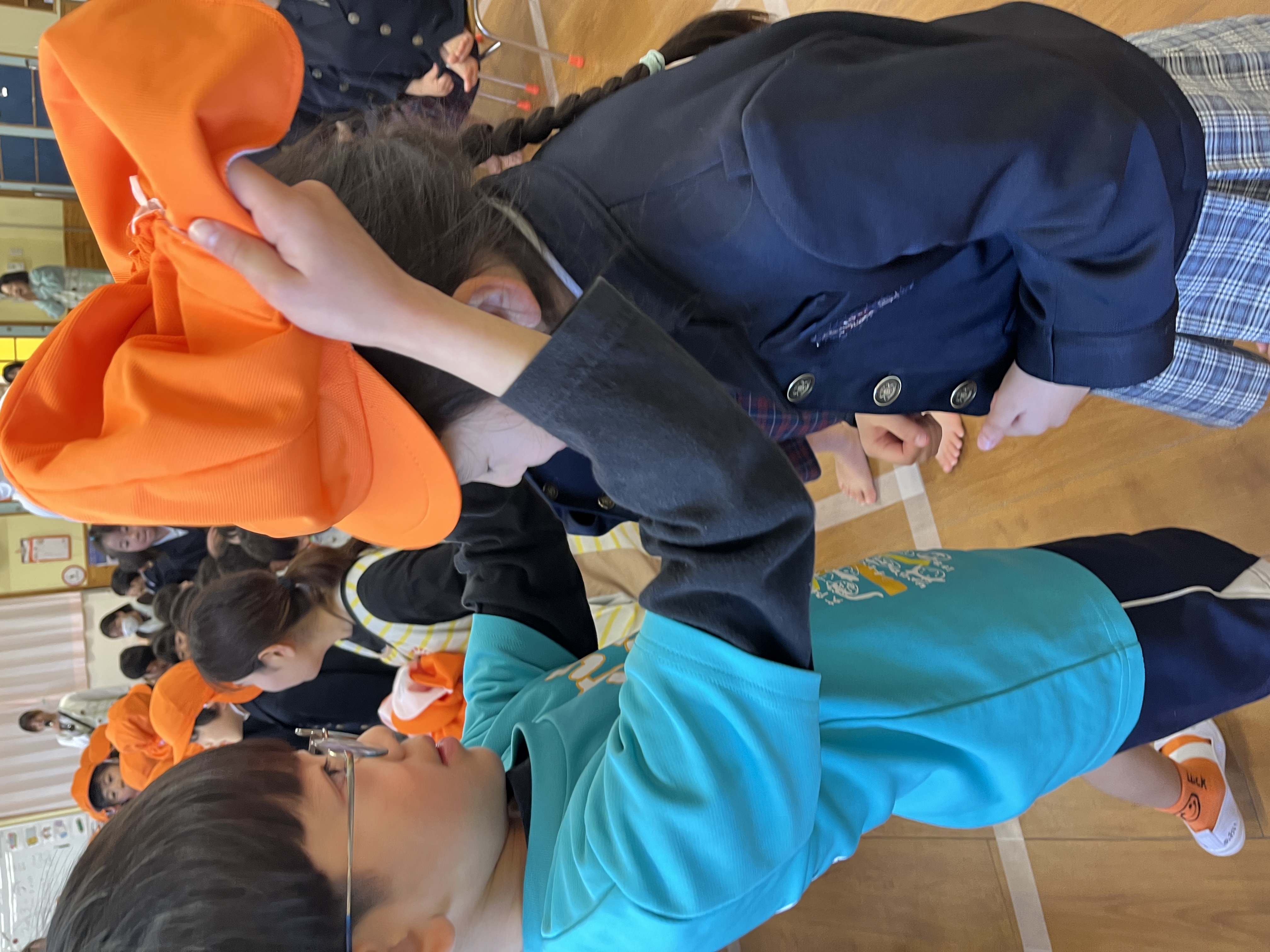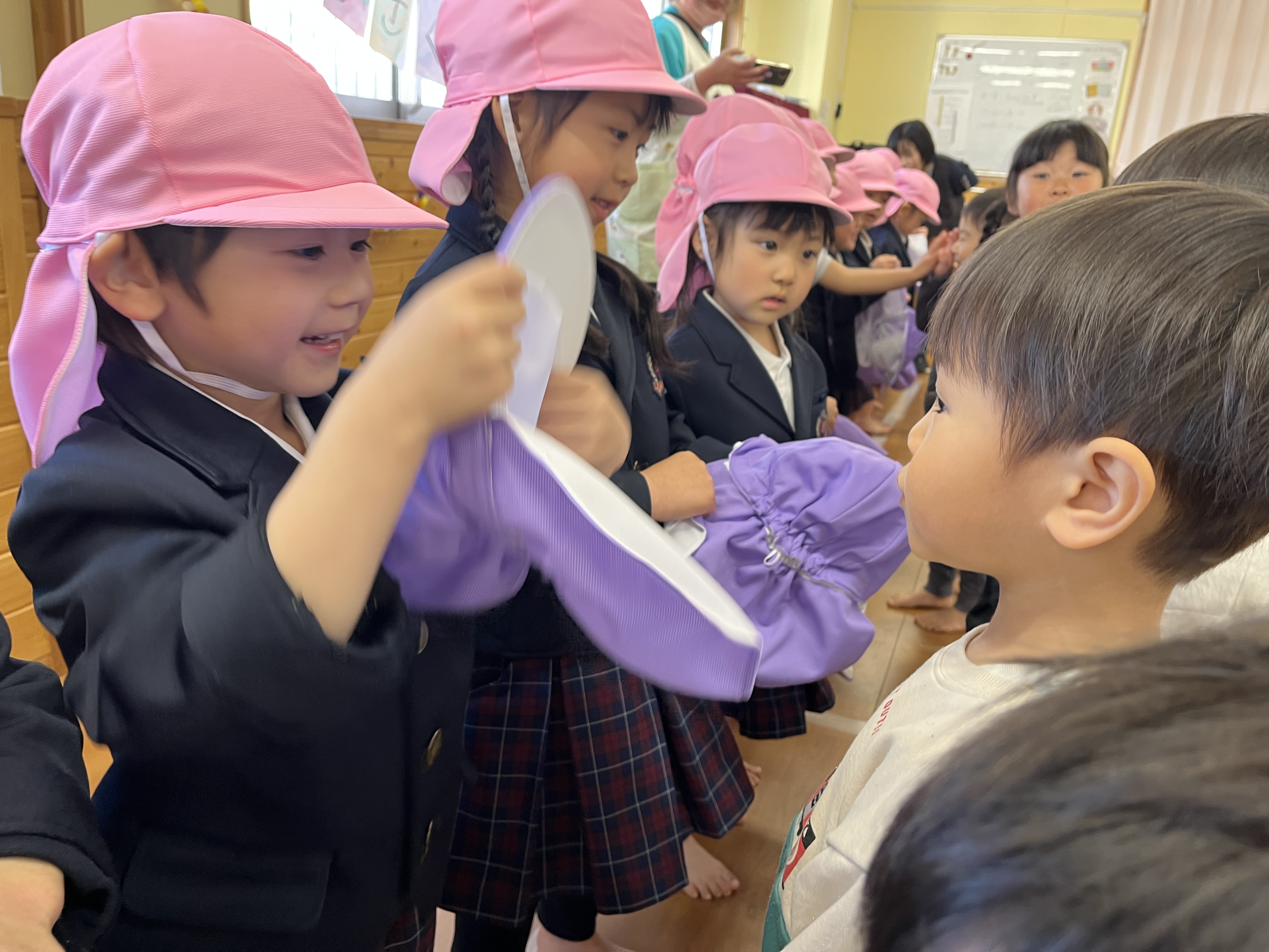 ひとつ上のお兄さん、お姉さんから憧れのカラー帽子を受け取った子どもたち。